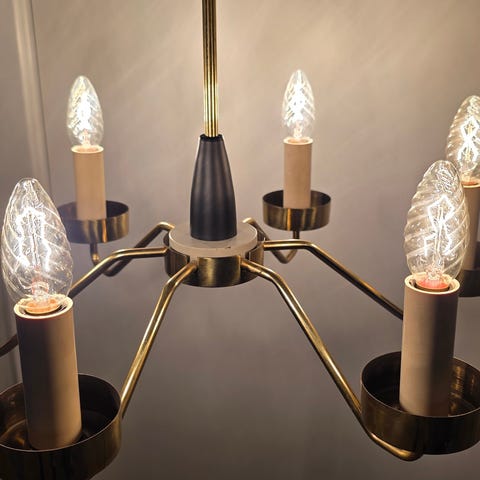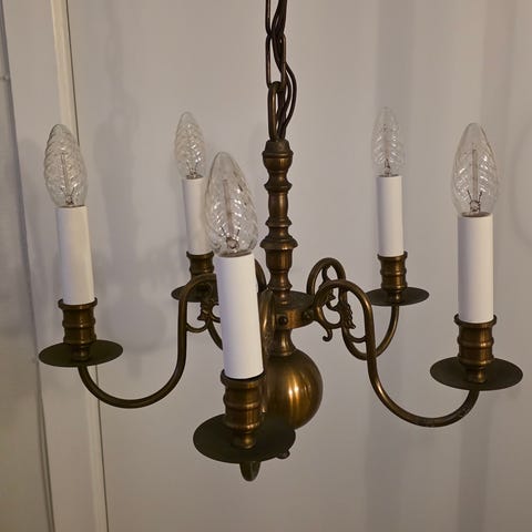 Klassisk gammel messinglysekrone med 3 arme. Kædeophæng, med øje skjult til ophæng