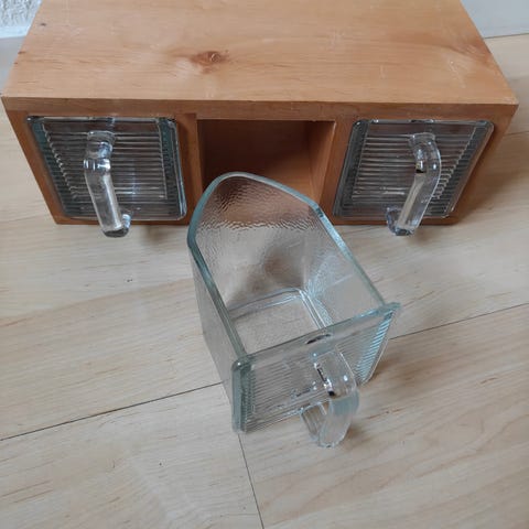 Sælger rigtig flot køkken hylde (københavner) i lyst træ med 5 flotte glas skuffer. Hylden er meget anvendelig til sukker mel og gryn, krydderi eller krea. Ingen orme huller. Er lidt rugflet ved et par skuffer. Ingen afslag. Sendes ikke, da hylden er lidt tung.