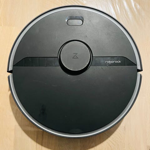 Roborock S6 robotstøvsuger i hvid farve. Støvsugeren et med ekstra tilbehør, herunder udskiftelige filtre og moppeklude, børster.
