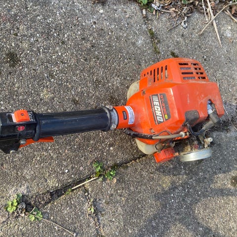 Echo SRM-2450 buskrydder med benzindrevet motor. Udstyret med en lang skaft og græsklinge til effektiv trimning af græs og ukrudt. Farve: orange. Velegnet til udendørs havearbejde. Der medfølger hoved til plastknive, til græs. Seriøst bud modtages.