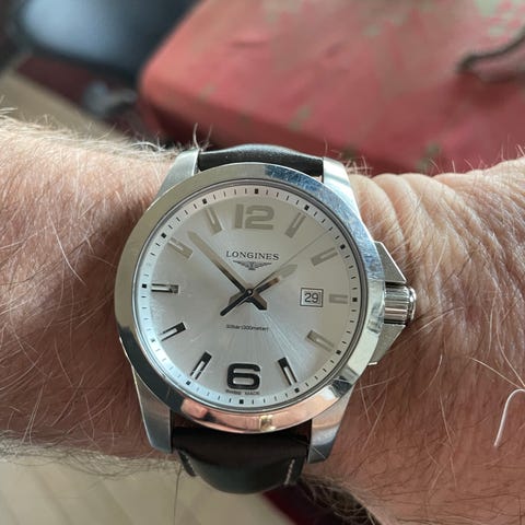 Jeg sælger mit Longines Conquest i bicolor med quartzværk. Uret blev oprindeligt solgt som herreur, men har en størrelse, der i dag vil blive betragtet som unisex.