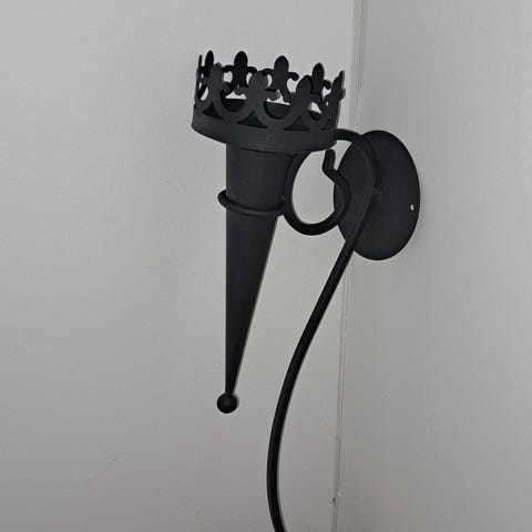 Sælger to stilrene væg-lysholdere i sort metal. Passer til fyrfadslys og giver et flot geometrisk skygge-look på væggen. Begge er i pæn stand.