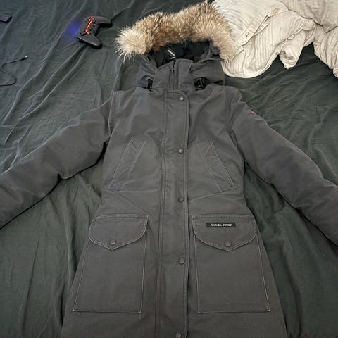 Canada Goose Trillium Parka i metallic/blankt stof, str. XS. Har et meget lille hul ved den ene lomme samt lidt lysere ved lynlåsen. Har en syning bagpå efter et hul. Manglerne ses ikke medmindre man ved de er der.