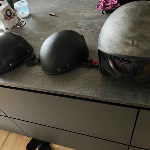2 stk.Motorcykelhjelme i mat sort farve. Hjelmen har en klar visir, ventilation foran og på toppen samt polstret indvendig for komfort. Designet til at give fuld hovedbeskyttelse ved motorcykelkørsel.