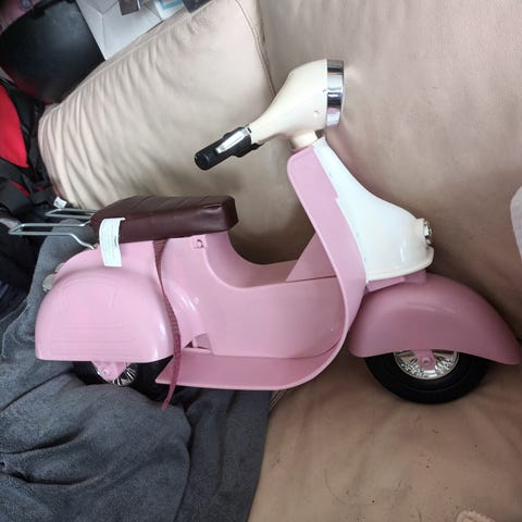 Sælger denne Barbie på scooter. Alt er originalt Barbie Mattel. Scooteren kan stå på støttefod med Barbie siddende på.