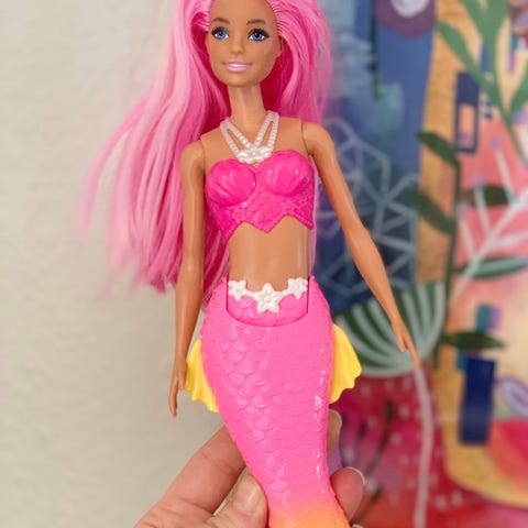 Barbie Havfrue Dukke med skiftbar hale i blå og pink farver. Dukken har en aftagelig hale, der kan ændres mellem to forskellige farver. Materialet er plast, og produktet er designet til børn. Leveres i original emballage.
