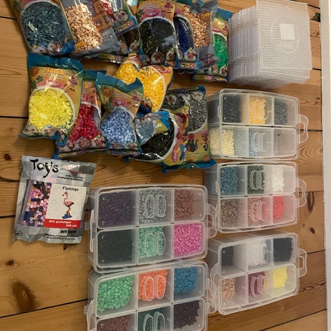 Indeholder diverse perler, palietter, smykkesnor og låse.