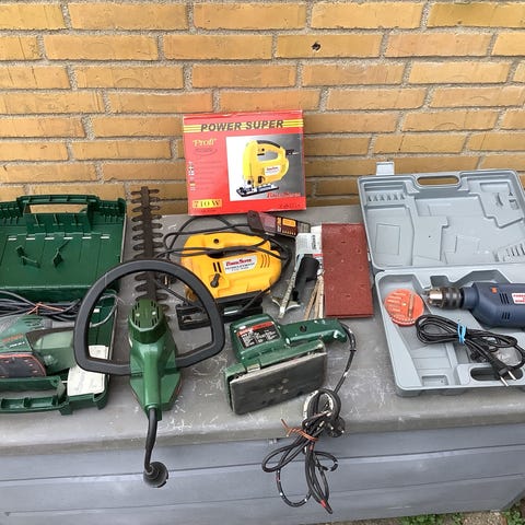 Forskelligt værktøj bl.a.Bosch CSB 680-2E boremaskine med elektrisk ledning, grøn farve, egnet til boreopgaver. Bosch BKS 230 rundsav med 230 mm klinge, egnet til savning i træ og andre materialer. Bosch hækkeklipper med elektrisk ledning, designet til beskæring af hække og buske. Alle værktøjer er elektriske og beregnet til gør-det-selv og professionelle brug. Kom gerne med et bud hvis du er interesseret i noget.