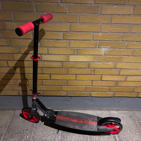 Fuzion Z300 løbehjul med rød og sort farve. Løbehjulet har et robust design med greb i rødt og et deck med farverige detaljer. Egnet til børn og unge til transport og fritidsbrug.