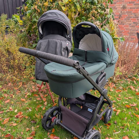 Derudover har medfølger klapvognsdel (som har brugsspor), og selve stellet kan man også få med - dette er dog i stykker, men kan fikses af en med hænderne skruet ordentligt på. Garanti er desværre udløbet (købt i november 2021). Mørkegrøn.