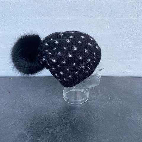 Fantastisk lækker og utrolig let hue strikket i det fineste alpaka garn med kvast i ægte ræv.