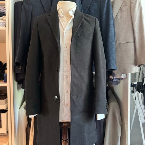 Frakke, str. L, HM, Flotte frakke sort , størrelse 50 , brugt kun en gange , står som ny og fejler intet .