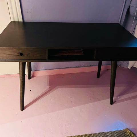 Vi sælger vores skrivebord, som stadig står flot, men har nogle ridser/mærker efter brug (derfor prisen).