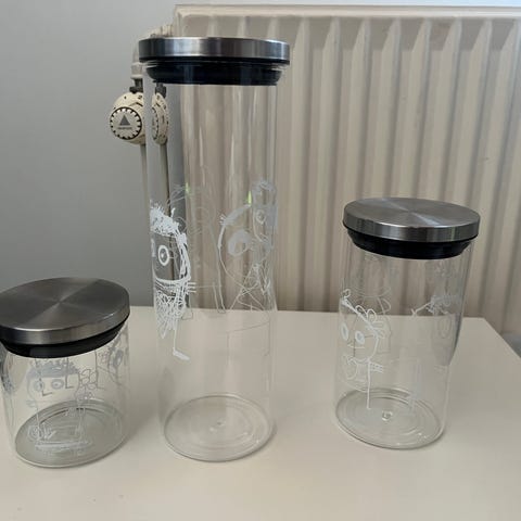 6 glasbeholdere /opbevaring med låg. Den højeste er 26 cm, 18 cm, 11 cm og de 3 mindste er 9 cm høje.