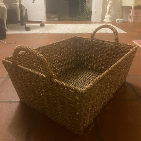 Kurven er brun og har indbyggede håndtag på siderne for nem transport.