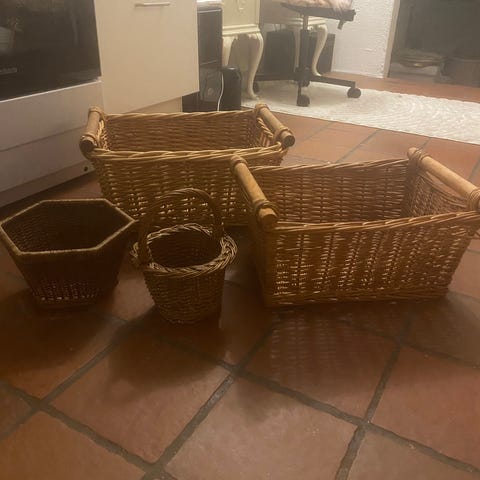 Kurvene varierer i størrelse og form, herunder både runde og firkantede designs med og uden håndtag.
