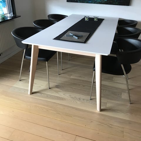 Spisebord i hvid højtrykslaminat med sortlakeret kant. Tillægspladeskinne i metal. To tillægsplader medfølger (hver 50x100 cm).