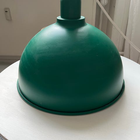 Stor loftslampe med industrielt look med rød stofledning. Måler 30 cm i diameter og 37 cm.