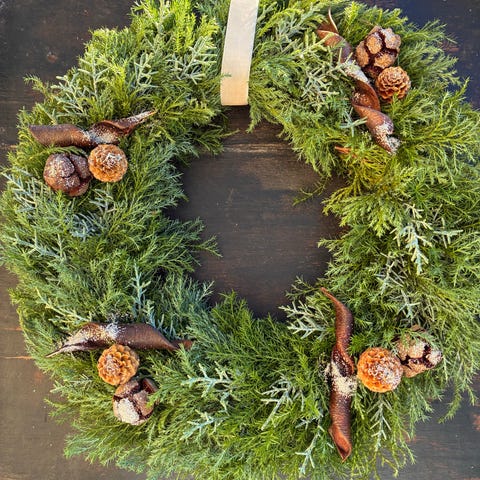 En krans på halmbase med naturgrønt og rødt bånd med glitter. Der er ‘usynligt ophæng’ monteret med fiskeline.