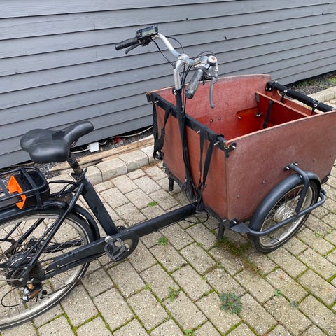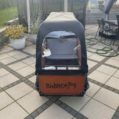Babboe E big fra 2020. Cyklen har kørt knap 300 km, så stort set ikke brugt. Batteri virker fint, men der skal købes nyt display hos Babboe (ca 1500 kr). Kaleche og hynder medfølger naturligvis Nypris 20000