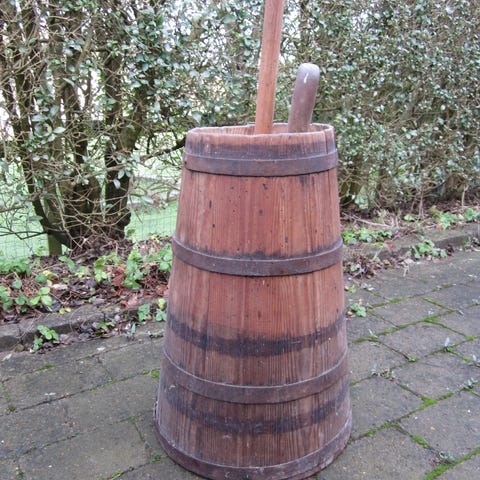 Antik smørkærne år 1900 . i bejdset træ. H. 55 CM. B. 37 CM. D. 37 CM. afhentes i Sønderborg.