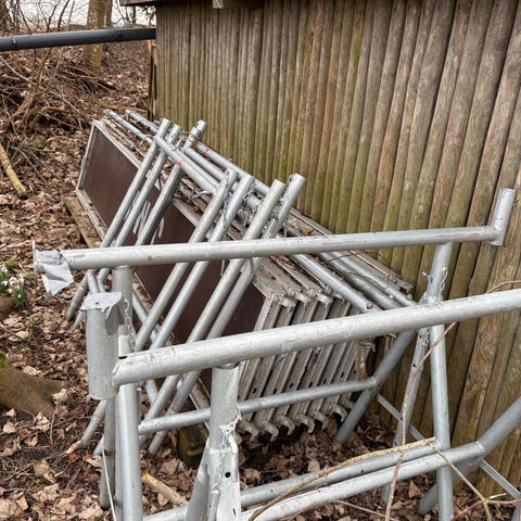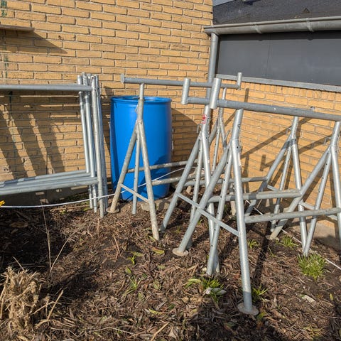 God stand, galvaniseret. 15 meter. 10 plader, 6 bukke.