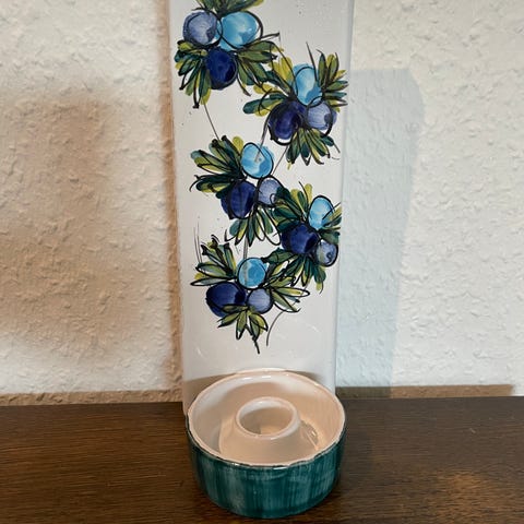 Flot vintage keramik vægstage (kan hænges på et søm) af Lund. Brun udvendig og blå indvendig. Plads til et stort lys. Højde 15cm, dia 11cm. Perfekt stand.