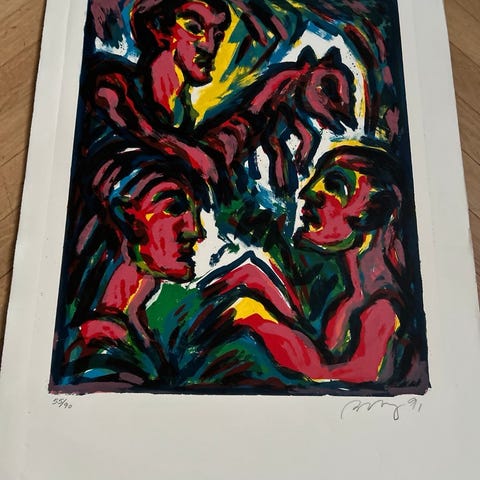 Sæt bestående af 3 kunsttryk med motiver af farverige figurer i abstrakt stil. Hvert tryk er indrammet og signeret. Motiverne viser forskellige menneskefigurer i bevægelse med brug af primærfarver som gul, rød og blå. Velegnet til vægdekoration i hjem eller kontormiljø.