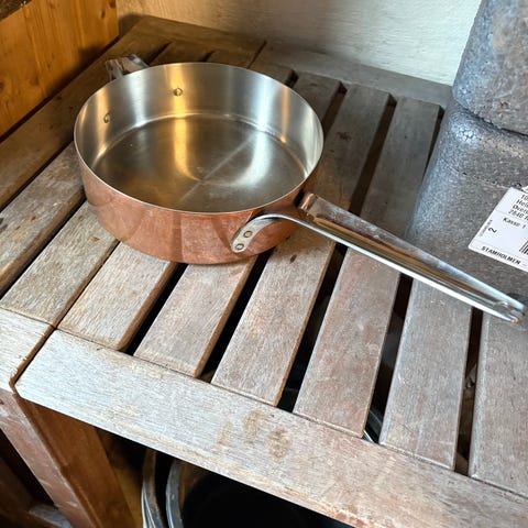 Georg Jensen kobberpande sandsynligvis sølvbelagt indvendig og med rustfrit stål håndtag 25 cm i diameter, 7 cm høj. Designet af Henning Koppel for Georg Jensen. Næsten ikke brugt. Et vintage produkt der kun findes brugt. Dur desværre ikke til induktion