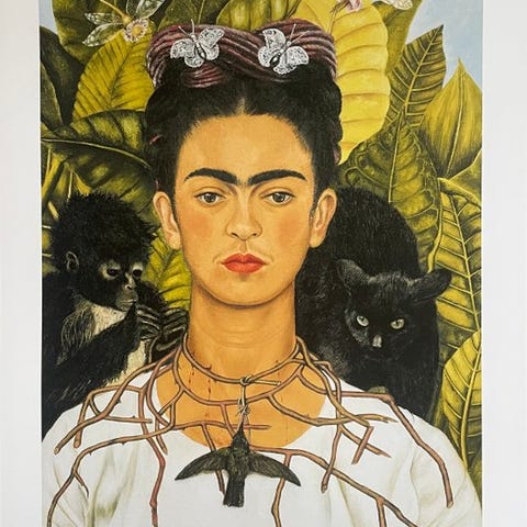 Frida Kahlo dreaming er titlen på maleriet. Jeg er meget fascineret af Frida Kahlos liv og hendes kunstneriske karriere. Hun var en dygtig maler og også en meget smuk kvinde. Hendes liv var ikke nemt, og hun havde mange smerter efter en bilulykke.