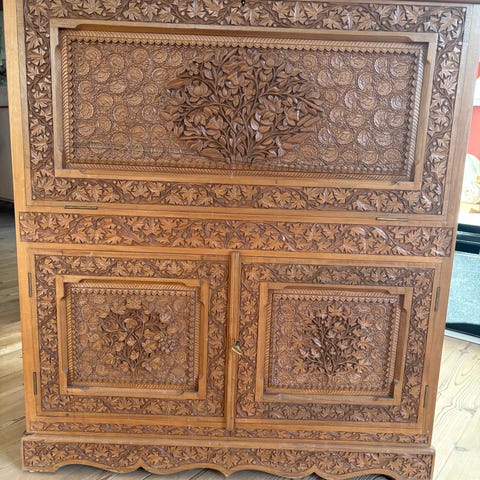 Super flot og spændende bar/reol, lavet af ædeltræ og fra Asien. Alle mekanisme fungerer, og den er i rigtig pæn stand.
