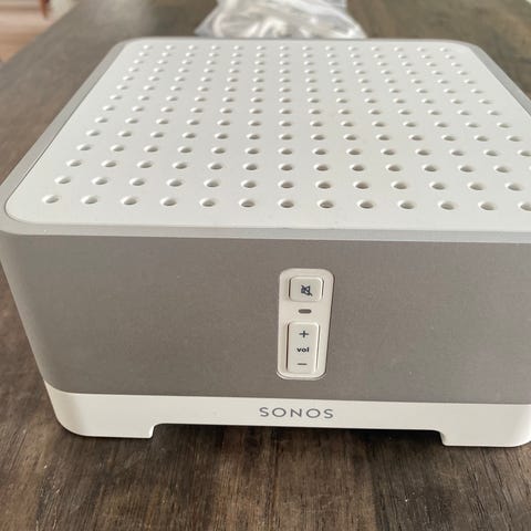 Sonos Connect musikstreamer i hvid farve. Enheden bruges til at forbinde traditionelle lydsystemer til Sonos trådløse netværk for streaming af musik. Indeholder kontrolknapper til lydstyrke og mute. Strømforsyning: 100-240V, 50-60Hz.