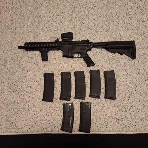 Sælger min DMR og lidt til da jeg vil prøve noget nyt der er en taske med 7 røg granater en B&T Rotex-V Lyddæmper 36g kugler et red dot sigte et ekstra inderløb støtteben et kort hi cap magasin og et mid cap magasin helt nyt glock 17 magasin 3 magasiner til P-07 batteri og lader og nogle pistoler 2 af dem er defekte det meste kan være i kufferten som med medfølger men røg granaterne er i en mil-tek taske for sig