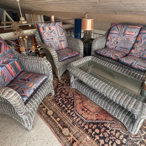 2 stole, en skammel, 2-personers sofa, glasbord og en lille kommode, som næsten ikke er brugt, sælges her.