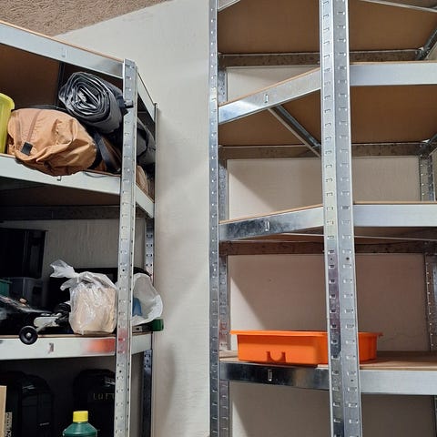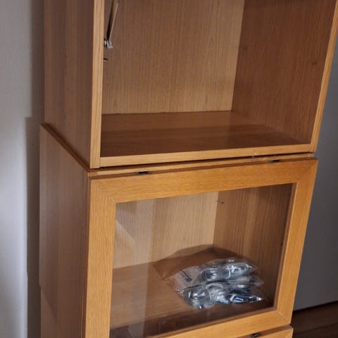 Begge er fra Harald Nyborg og fejler intet. De har stået i opvarmet bryggers i røg og dyrefrit hjem og kan afhentes i Holstebro centrum. De er sat sammen af flere reoler og derfor så høje. Den højeste er skilt ad - Siderne er 70x70 cm