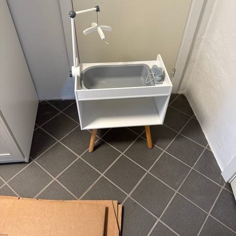 Puslebord til dukke i træ med sider i stribet stof. Kurv i stof, én bøjle i træ og puslepude medfølger.
