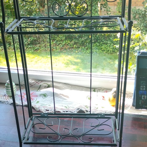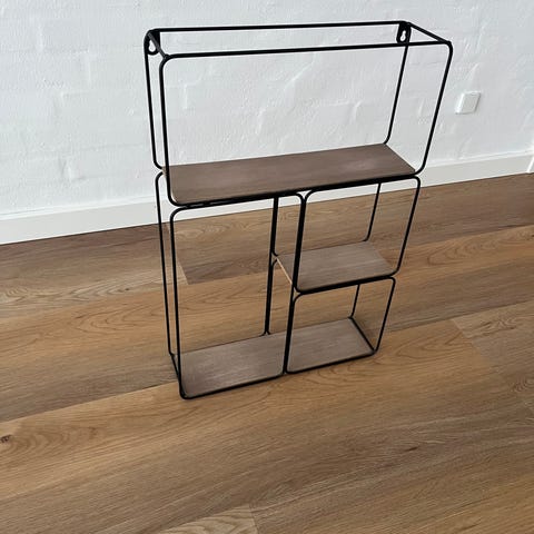 Dekorativ reol i metal og træ, kan klappes sammen. Højde 62 cm, længde 45 cm, dybde 19 cm. Kan både bruges som vægreol - eller stående. I fin stand. Kan sendes på købers regning.