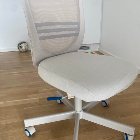 Hvid stol med smalle elegante armlæn og gråt sæde