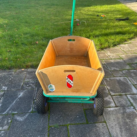 Foldbar trækvogn som fylder minimalt ved opbevaring. Plasthjul. Mål, samlet: 78 x 54 x 19 cm.