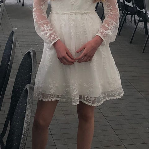 Model Erona, str 34. Mange fine detaljer; blonder ved håndled, lav ryg med knapper og lynlås. Længere bagtil. Lidt løs model.