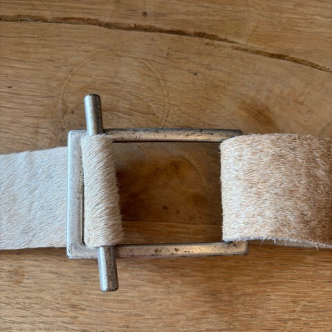 Meget smukt spænde, der f.eks. kan monteres med bred elastik/lærred/skind (max. 4 cm) som bælte eller som taskespænde. Mulighederne er mange. 4,5x5,3 cm.