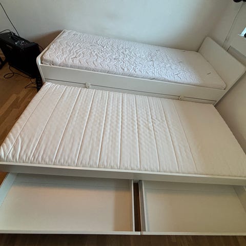 SLÄKT seng med underseng til en ekstra overnatter samt 2 skuffer til opbevaring.