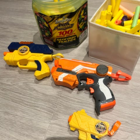 Tre Nerf-guns, to veste, og en pose med Nerf-skumpatroner.