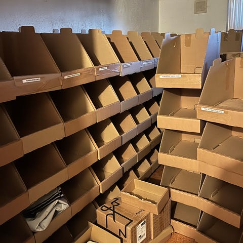 Diverse lagerudstyr og emballage bestående af paller med papkasser og plastikindpakning. Indeholder forskellige materialer og produkter til opbevaring og transport. Egnet til lagerbrug og logistik.GRATIS