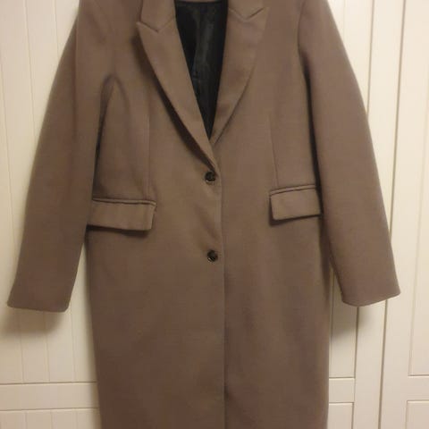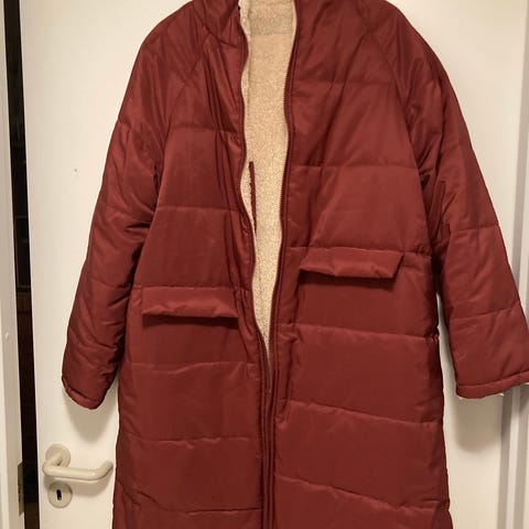 AMISU Frakke i størrelse S, farven rød. Jakken er en lang frakke med lynlås foran og to lommer med klap. Materialet er polstret for ekstra varme. Designet til kvinder.