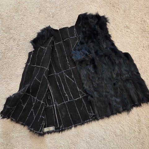 Lækker vest i pels (vaskebjørn) med blondefor (lilla, lyseblå og hvid).