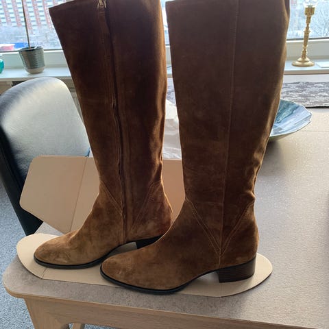 Leoyd støvler i størrelse 4½/37 er lavet af ruskind. Støvlerne har snørebånd og lynlås på siden for nem lukning. Sålen er lavet af gummi med mønster for bedre greb. Farven er en naturlig brun nuance.