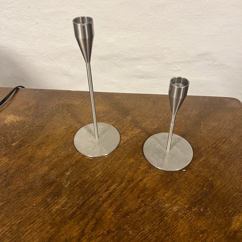 To lysestager Piet Hein I rustfri stål. Venus 21 cm høj og Mars 14 cm høj. Prisen er for begge.