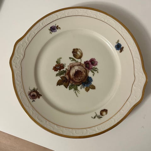 bladformet fad i porcelæn med håndmalet blomsterdekoration. Fadet har en unik form med et håndtag og detaljer i guld. Velegnet til servering eller som dekorativt element.