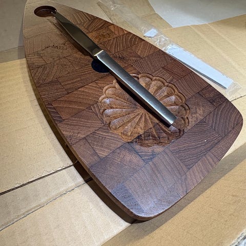 SKÆREBRÆT, teak, Digsmed, Danmark. Med kniv der sidder på magnetterne på skærebrættet bræt længde41 CM X 23 CM x 3 cm plus ca 12 mm fødder